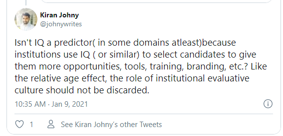 When you require higher points in Cognitive Tests to access institutions, success in that test can show up as a correlation to success. But this success should not be confused with causation. The test doesn't cause any success by itself. The social-institutions used the test to give more opportunities for people to learn, grow, and brand. It is this ignored variable that caused the ultimate success.