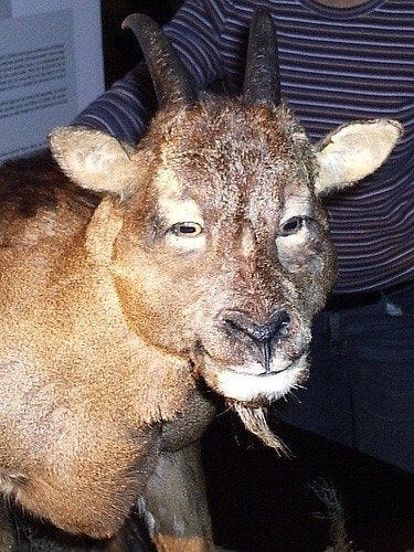 Balearic Islands cave goat had no predators for many generations of their evolution that their eyes moved from the side of their heads to forward-facing. The species had gone extinct when new stressors showed up (predators, humans, and others).