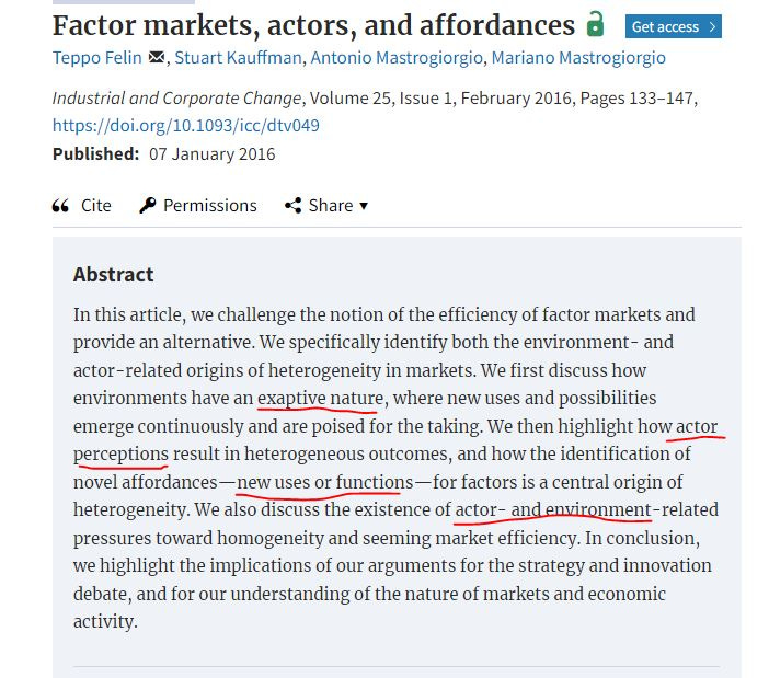This article, "Factor markets, actors, and affordances" by Teppo Felin, Stuart Kauffman, Antonio Mastrogiorgio, Mariano Mastrogiorgio covers a lot of complexity/evolution based ideas that are useful in entrepreneurship and general learning.