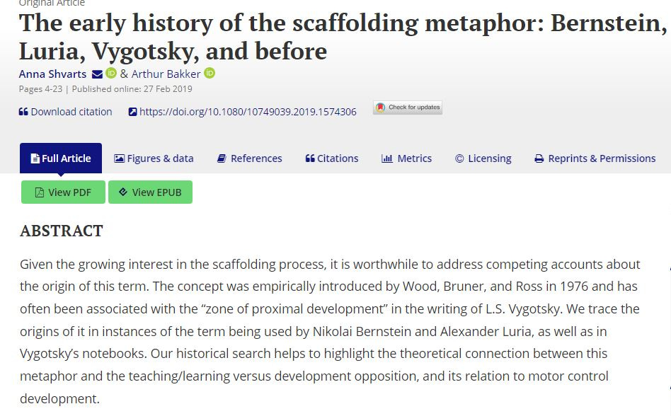 Interesting paper "The early history of the scaffolding metaphor: Bernstein, Luria, Vygotsky, and before", covers a lot about the historical evolution of modern conception of scaffolding metaphor.