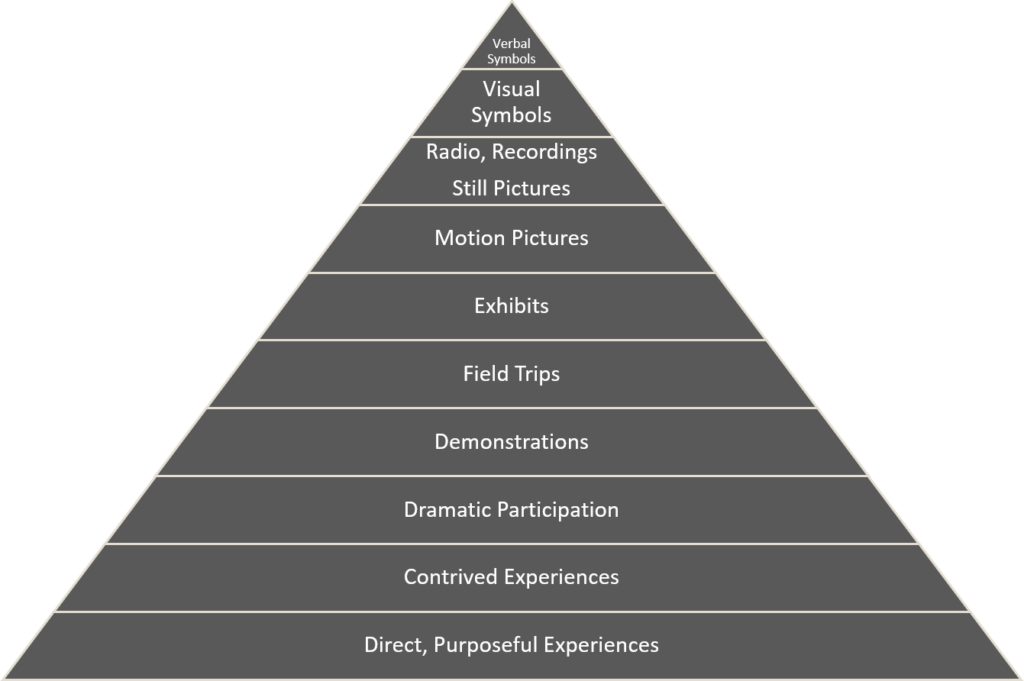 In 1946, Edgar Dale proposed a hierarchy of learning methods for adults. In this version, we can see teaching methods in a pyramid, without any numbers.