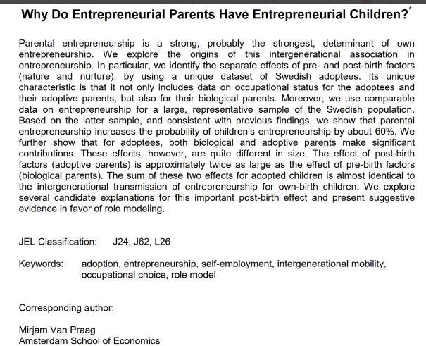 According to the paper titled " Why do entrepreneurial parents have entrepreneurial