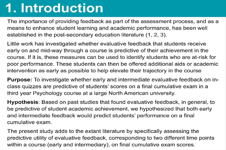 In the paper"Early, But Not Intermediate, Evaluative Feedback Predicts Cumulative Exam Scores in Large Lecture-Style Post-Secondary Education Classrooms", researchers Alice S. N. Kim and Sharry Shakory investigated whether early and intermediate evaluative feedback on in-class quizzes were predictive of students’ scores on a final cumulative exam in a third-year Psychology course at a large North American university.