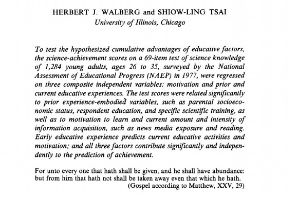 Matthew Effect in education was first coined by Walberg and Tsai in 1983 were they looked at cumulative advantages of educative factors.